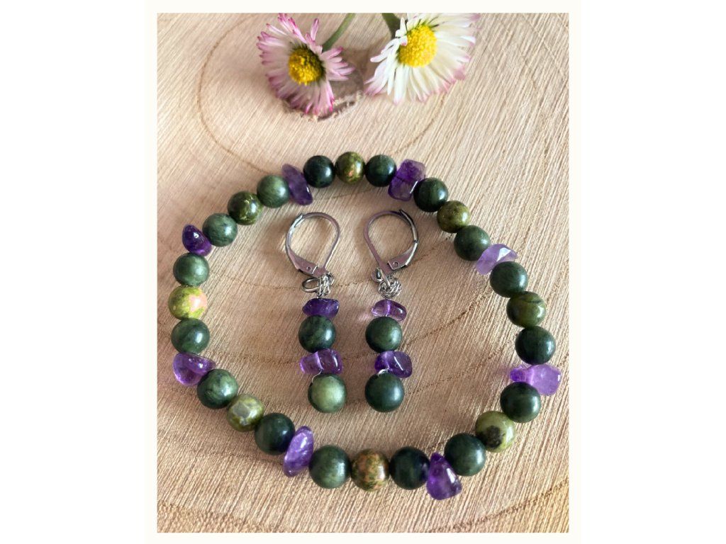Krásná sada náramku a náušnic s ametystem, jadeitem a unakitem