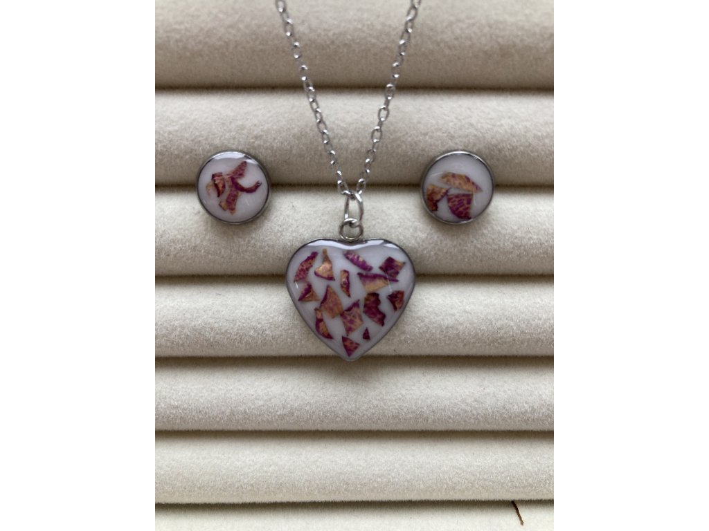 Elegantní sada ručně vyráběných šperků, která v sobě spojuje jemnost a nadčasový design. Sadu tvoří přívěsek ve tvaru srdce s pravou růží zalitou v pryskyřici, doplněný o malé kulaté náušnice – pecky, vhodné pro každodenní nošení.