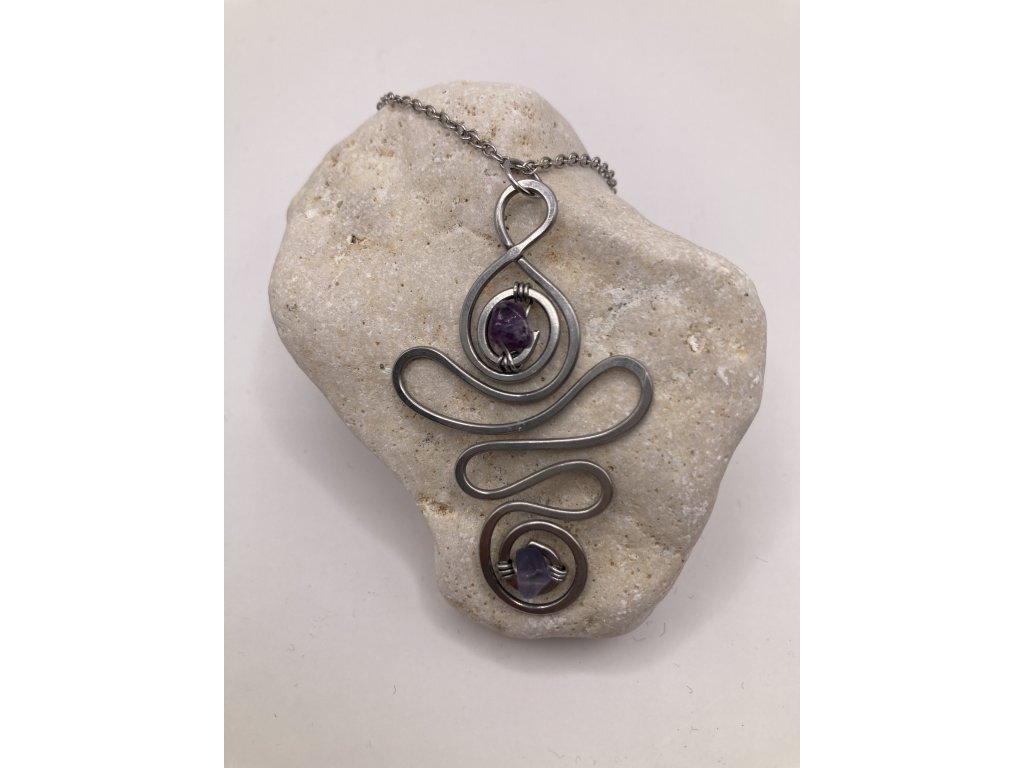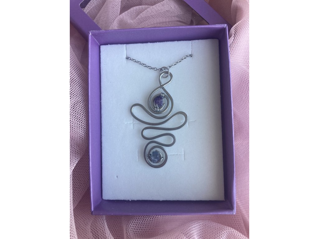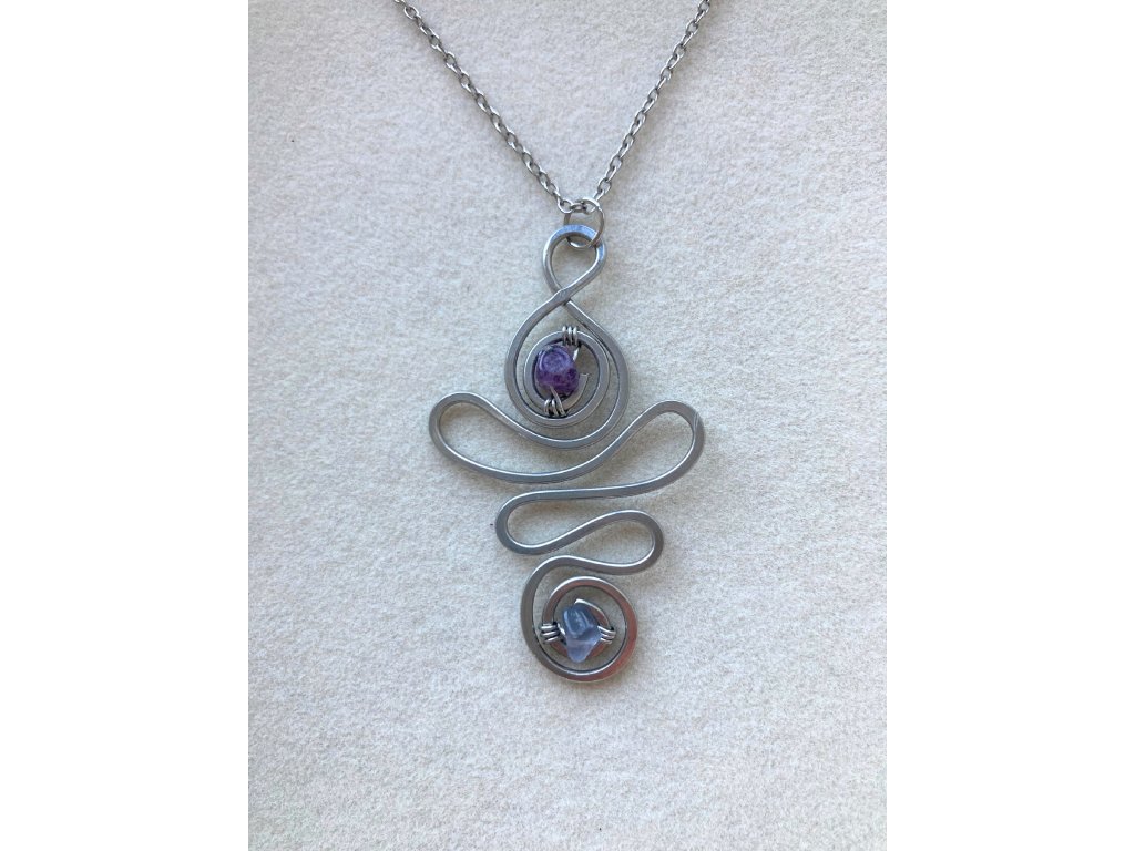 Přívěsek z chirurgické oceli s fluoritem je originální ručně tvarovaný šperk, který spojuje sílu minerálu s jemností ruční práce.